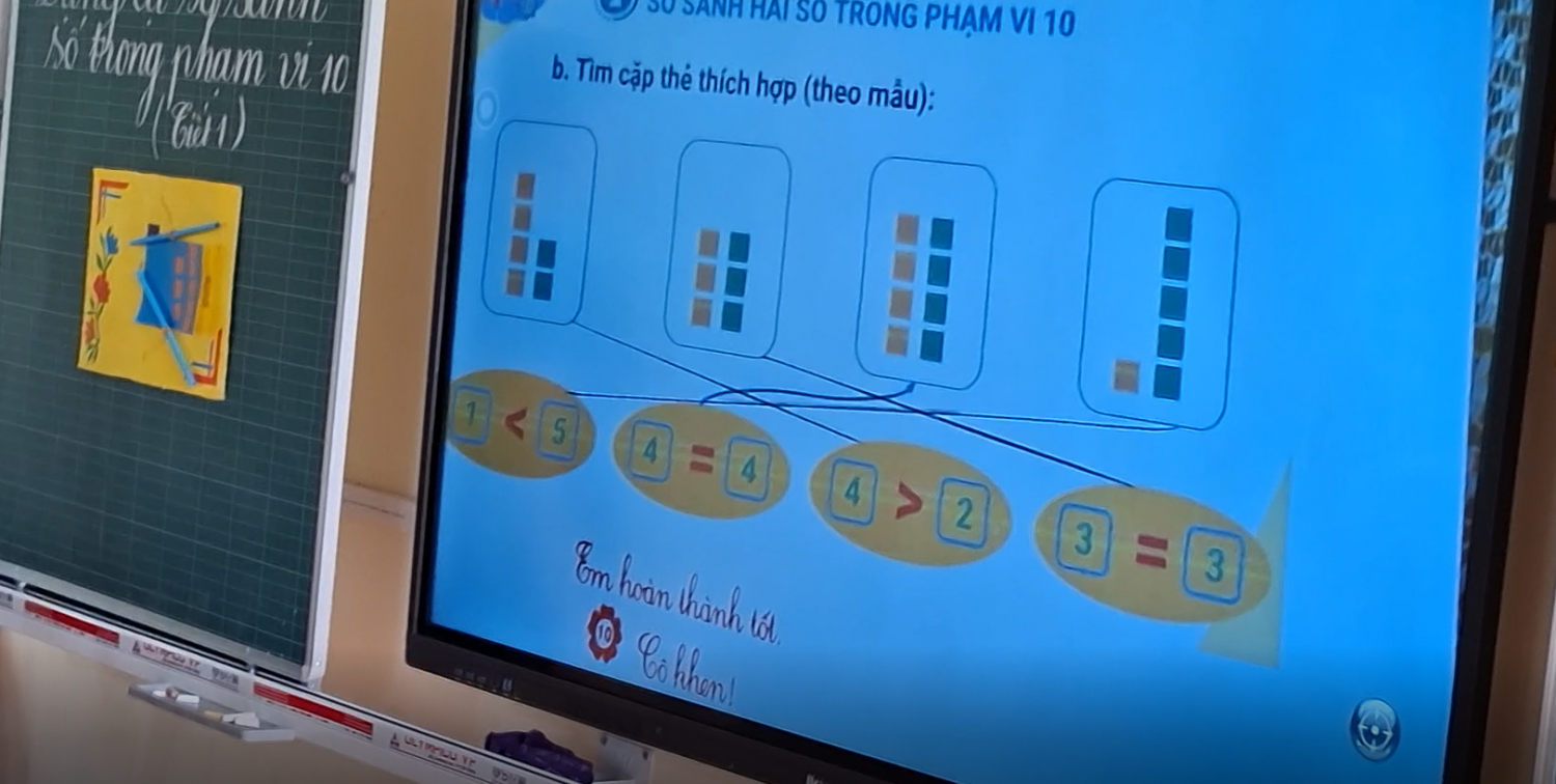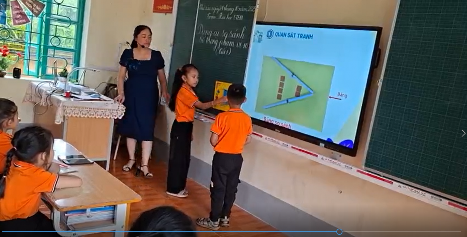 Tiết học đã lôi cuốn học sinh ngay từ những hoạt động đầu tiên của bài. Các em được quan sát vi deo sáng tạo thiết kế bởi AI, tham gia trải nghiệm và trình bày trước lớp về hoạt động trải nghiệm với dụng cụ so sánh số. Từ đó các em nêu được các vật liệu; tiêu chí để làm sản phẩm STEM “Dụng cụ so sánh số trong phạm vi 10” và rất thích mong muốn được thực hành tạo sản phẩm. Cô giáo đã kết hợp lồng ghép giáo dục cho HS biết thu gom phế liệu để tái chế và bảo vệ môi trường.